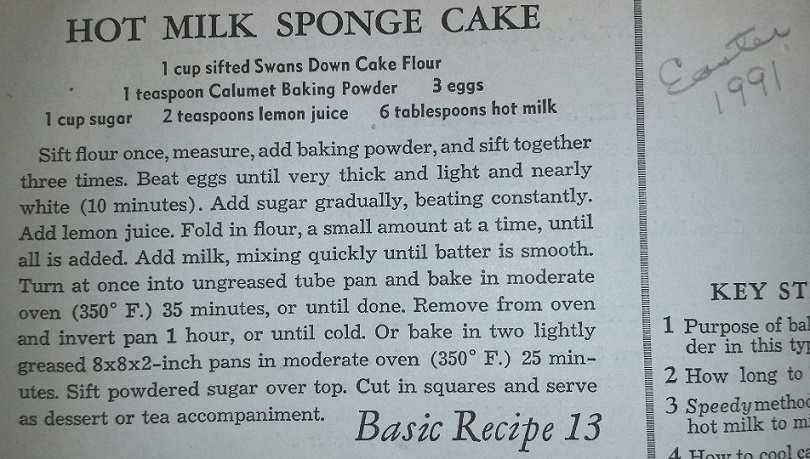 We jump to Easter of 1991 (which was March 31), and our Baker made no other notations. When I read over the recipe for Hot Milk Sponge Cake, it seems like it might produce a skimpy amount of batter for a tube pan. But after 10 minutes of using an egg beater, I would hope that the volume of the eggs with the other ingredients would produce a more substantial batter.