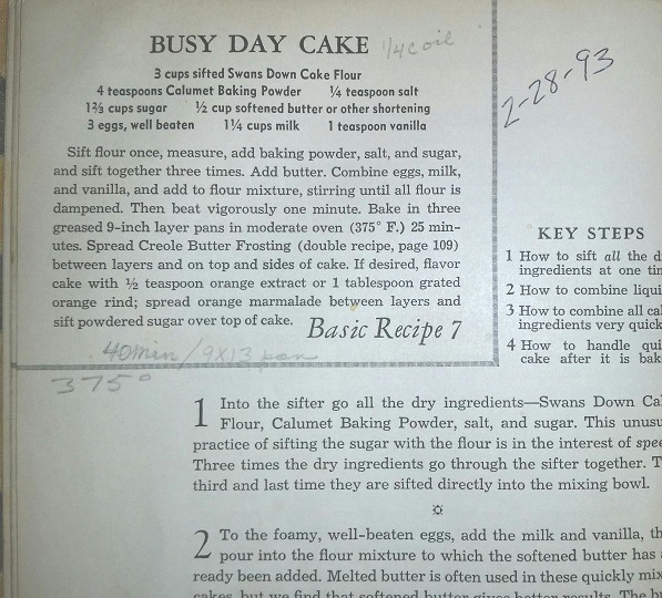 On February 28, 1993, our Baker used ¼ cup of oil instead of the butter or shortening for the Busy Day Cake. A useful notation was added for the pan of choice, namely a 9” x 13,” and future bakers were alerted that should they follow in her (or, maybe even “his”) footsteps, the cake would take 40 minutes to cook at 375 degrees.