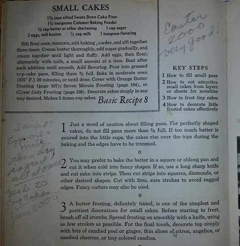 Our Baker made this recipe of Small Cakes on April 23, 2000 (Easter) and declared it “Very Good!” Once again, Clever Judy Frosting is recommended, as is Seven Minute Frosting (see above). It must have turned out well, for she/he made this same recipe again in June. However, this time our Baker first mixed the egg, oil and milk and then mixed in the dry ingredients all at once, a complete deviation from the written recipe. We may never know the results of this cheeky changeup, but we suspect it turned out fine since she/he took the time to let us know the recipe yielded 20 cupcakes. Well done!
