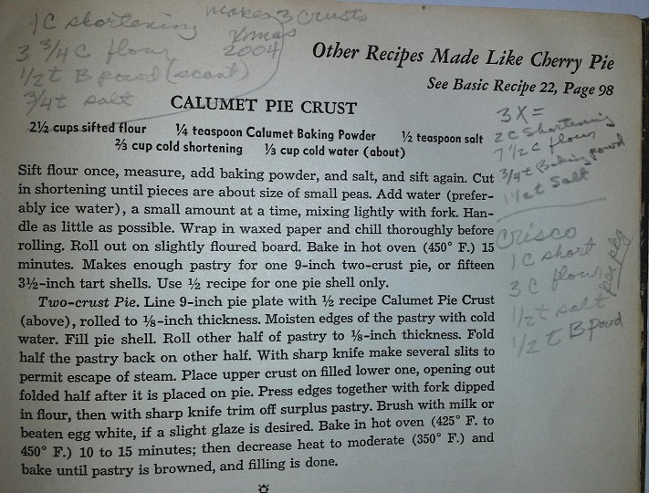 Our Baker was busy baking pies for the Christmas 2004 holiday (perhaps for a large family or for a holiday bazaar), and this straightforward Calumet Pie Crust recipe must have been a favorite. Notations were made to adjust the recipe for three double crusts, and another notation seems to increase it further to 9 double crusts (3x). I confess I am not sure what the notation at the right margin bottom means, but I suspect it is the pie crust recipe found on the label of a Crisco can. Below this recipe is one for a Crisscross Apricot Pie with pineapple, and I have to say that after a quick go-over, I might have to try my hand at pie making. Good job, Baker!