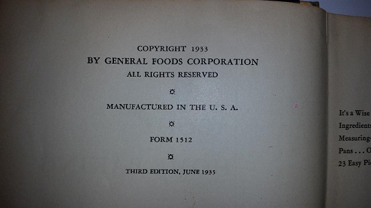 All About Home Baking was published in 1935 by General Foods Corporation (and was subsequently published periodically thereafter). Chapters include: “It’s a Wise Woman Who Knows Her Baking Rules” and “Some Bright New Menu Ideas for the Hostess.” Other chapters include an overview of utensils, measuring, and setting the proper oven temperature. And while the tips on cooking utensils every woman needs or the proper method of measuring or the definition of a “slow oven” are important ones, I must point this out: even the recipes are not the most fascinating thing about this cookbook. No, the most wonderful thing about this book is that it’s a survivor. It survived Sea Biscuit beating War Admiral, the decline of the use of silk stockings, the introduction of Swanson frozen dinners, the cancellation of Star Trek, maxi dresses, MTV, the beginning of the World Wide Web, the final Peanuts comic strip, and cell phones without buttons. A little skeptical? I understand. But don’t take my word for it. Below are eight inscriptions from previous owners of All About Home Baking, in chronological order.