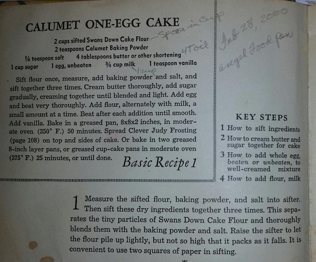 On February 28, 2000, our Baker, now secure in the 21st century, offers handy tips for making the Calumet One-Egg Cake recipe which, unsurprisingly, calls for two teaspoons of Calumet Baking Powder. We are informed that four tablespoons of oil work just fine instead of the four tablespoons butter or other shortening that is called for, and we should take care to spoon our flour into the measuring cup. Our Baker prefers to use one cup of milk instead of the stated ¾ cup, and that an angel food pan will work as well as the 8x8x2 pan. The Clever Judy Frosting (see above) is recommended as the frosting of choice, and I heartily approve of this inspired pairing!