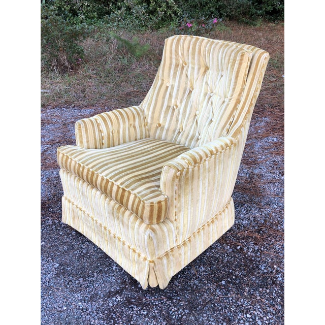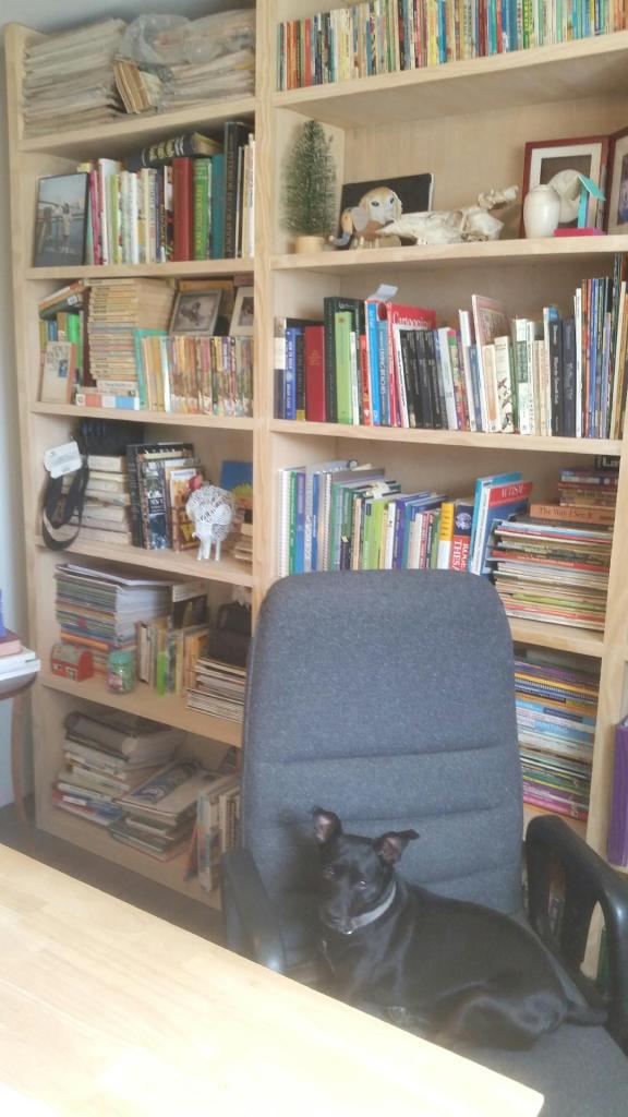 With the desk in place, I needed one more piece of furniture–a comfy chair–and I found it at the Habitat for Humanity Restore in Galesburg. It was pure 1970’s and a steal at $35.00. When we brought it home, I steam cleaned it and removed the skirt around the bottom, exposing the legs. It was, indeed, a comfy chair and looked fabulous in my library. Unfortunately, one of our dogs, unhappy that we went away and had hired a house sitter, destroyed it.