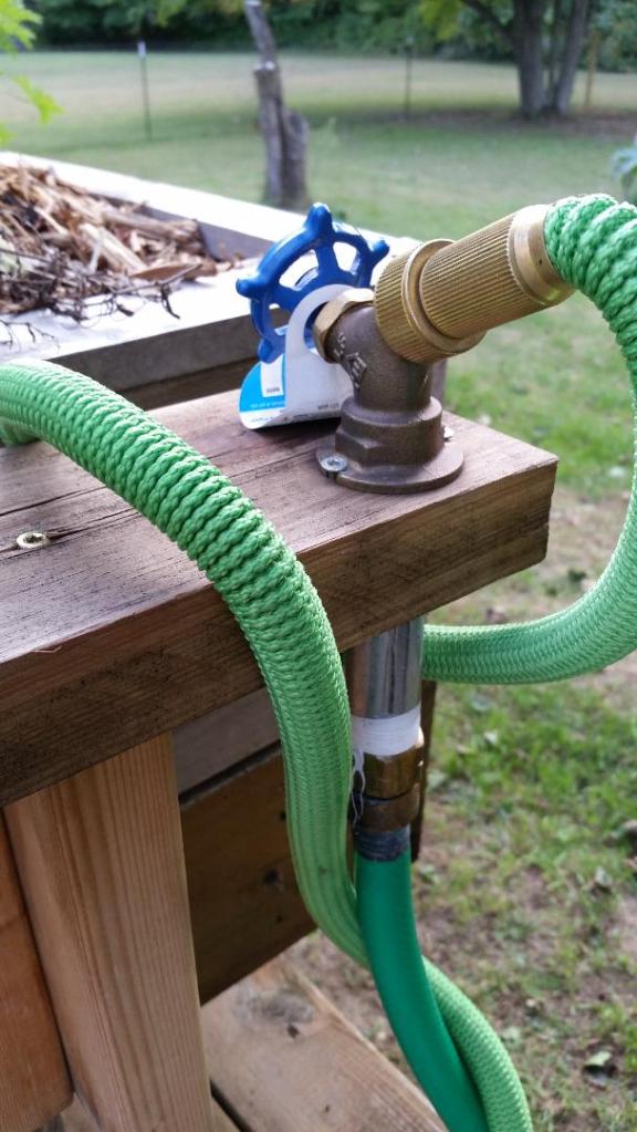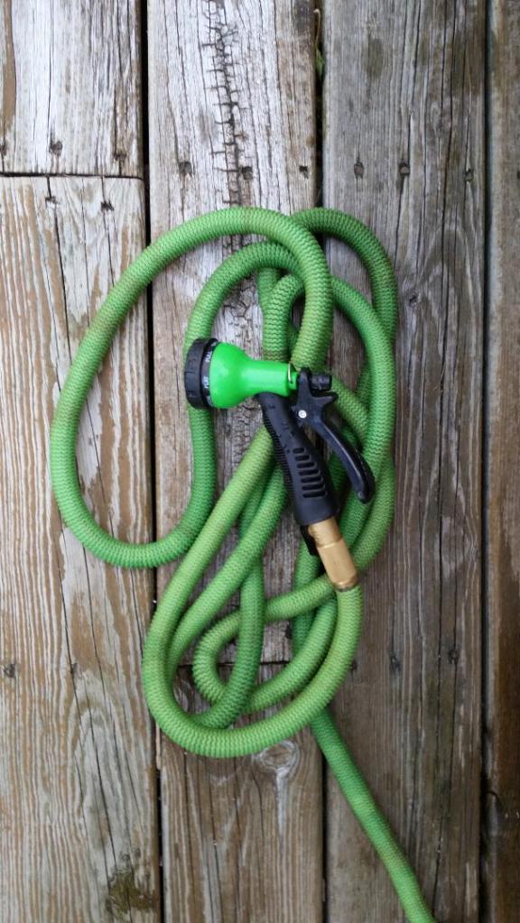 Old hose supplies water from house spigot.