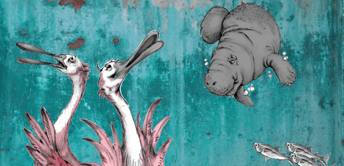 Roseate spoonbills, manatee and mullet illustrations by Lori Taylor.