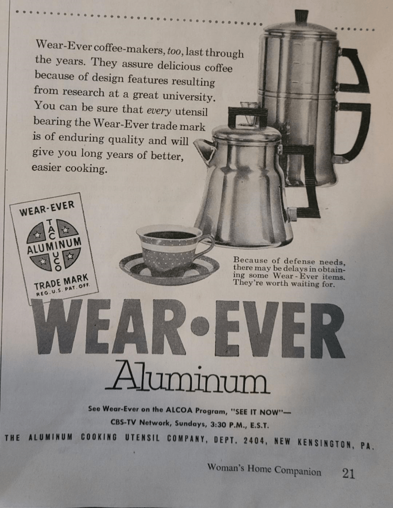 These Wear-Ever coffee pots would be similar to the one Raymond uses to make his too-strong coffee at the Gilbert Cottage. Water is added to the bottom, and coffee is added to a basket at the top. When the water boils, it is forced through a vertical tube attached to the basket. With this method, the coffee can be cycled many times, making a very strong cup of coffee!